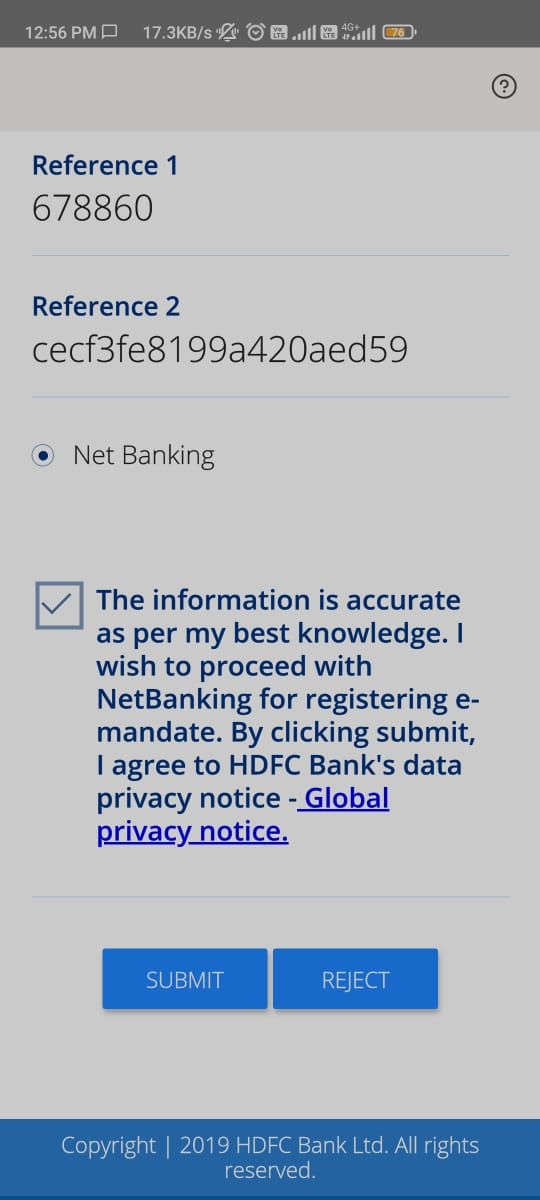 To authorise the mandate, you will be directed to your registered bank's net banking portal. Once you have completed the verification process, your bank mandate will be immediately activated.